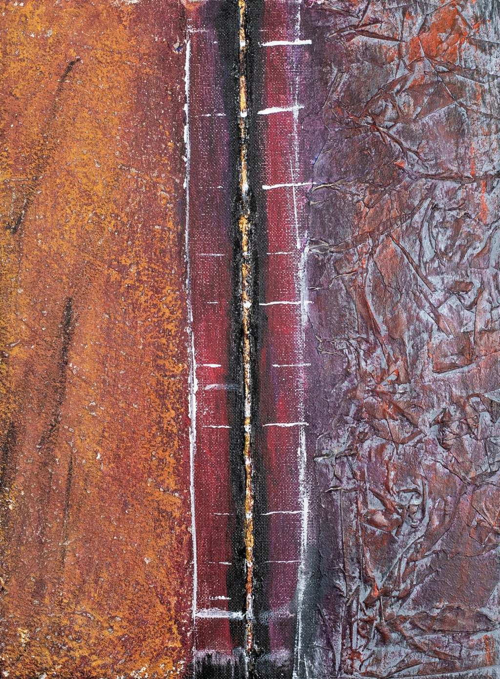 La linea centrale suddivide quasi equamente le due parti del dipinto.La differenza di tecnica messa in atto , aiuta a rafforzare l’idea del distacco e la separazione che regna fra le parti. Divisioni è la mia interpretazione del distacco che si ha durante il proprio percorso, tra ciò che era e ciò che sarà. Come un puzzle fatto di tante piccole esperienze, tutte diverse tra loro ma al tempo stesso, parti integranti del nostro cammino.