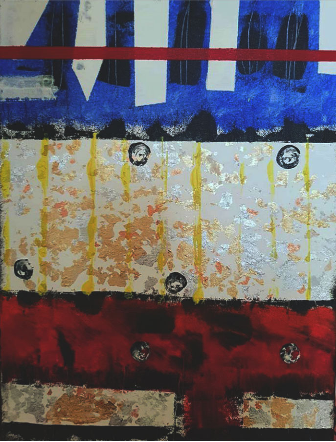 Colori forti, materiali di pregio come l’oro e argento per questa tela, dove si può notare come un paesaggio capovolto. Le linee che ben delimitano le zone colorate da quelle con il materiale. Metafora del mondo globalizzato, dove i propri fondamentali vengono stravolti. Tutti connessi inconsapevolmente da fili comuni.