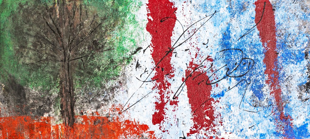 Un’esplosione di colori che rende felici, l’albero inciso a simboleggiare la costanza. Le linee rosse, quasi paiono cicatrici su questo sfondo tenue. Riportando alla mente i segni del passato anche quando diamo uno sguardo al futuro, per non dimenticarci il nostro percorso.