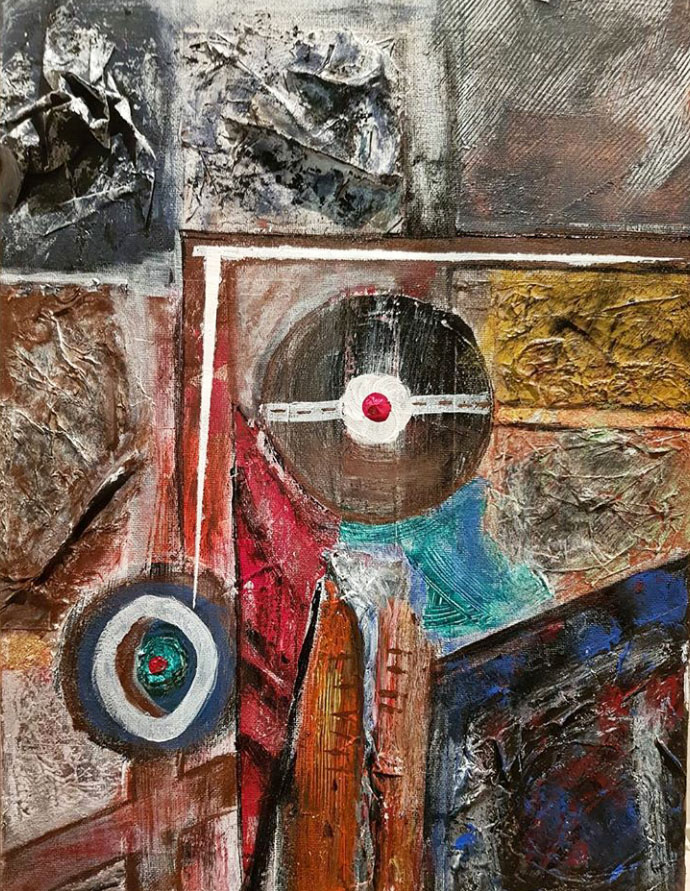 Che grado di immaginazione pensiamo di avere? Sicuramente questo dipinto da libero sfogo alla nostra fantasia, infatti guardandolo attentamente si riscontrano in esso svariate figure, volti, apparentemente non comunicanti tra loro. Come ci fosse l’unione di diversi universi sullo stesso piano. Materia ed immaginazione si scontrano su questo dipinto, dove la materia, interpreta la saggezza degli anni vissuti. Il resto del quadro vuole spronare l’immaginazione dell’osservatore, per permettergli di notare immagini celate all’interno delle linee e colori del dipinto.